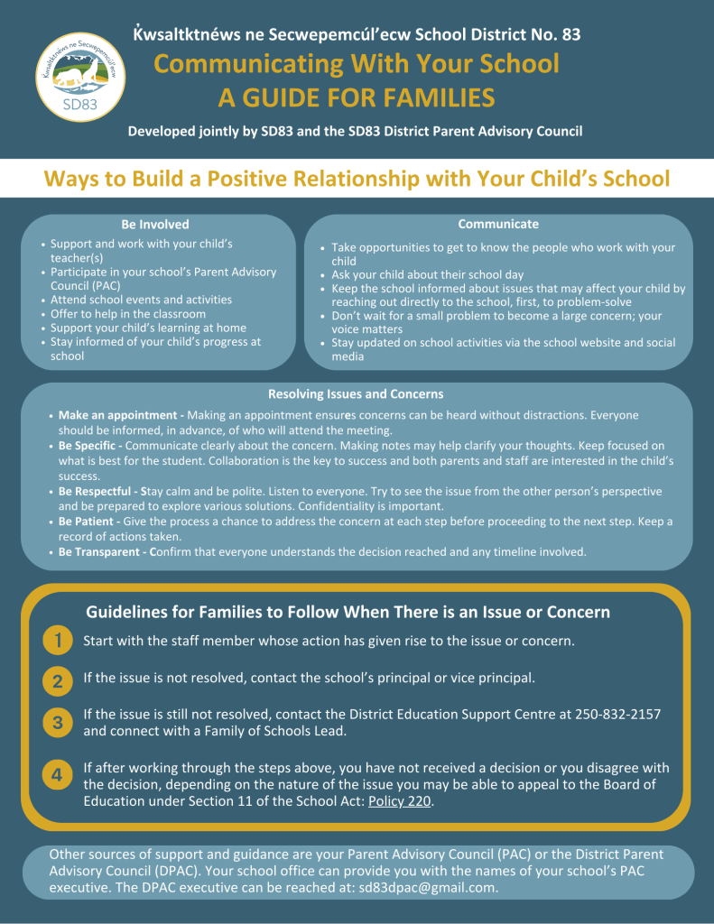At SD83, we believe in working together to support our children. SD83 Leadership and the District Parent Advisory Council jointly developed guidelines intended to help prevent and/or resolve conflict.